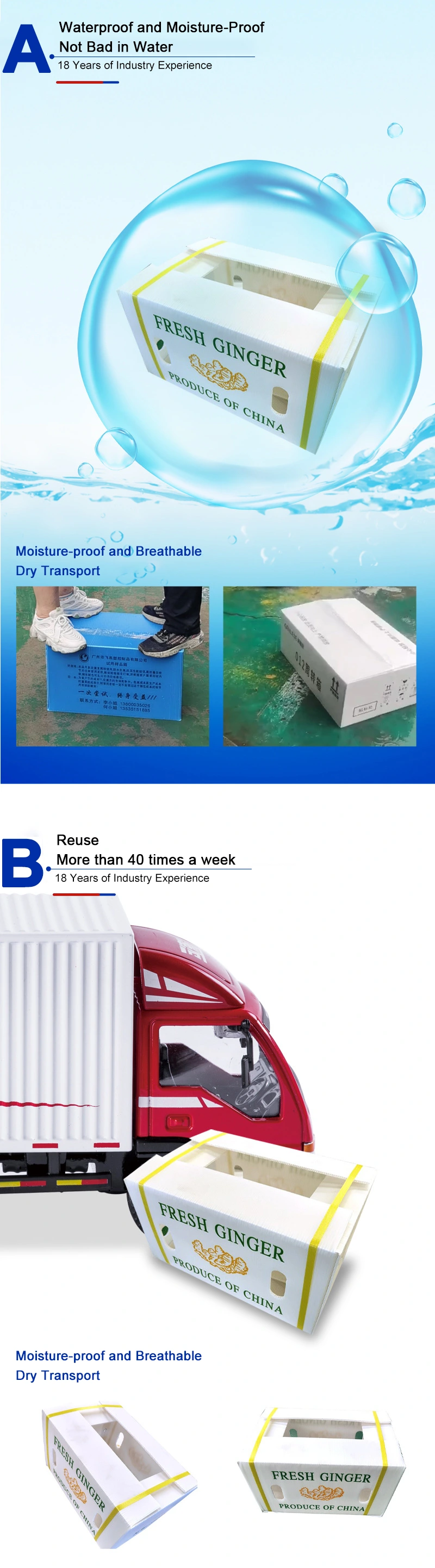 Zalety świeżych pudełek z warzywami PP obejmują trwałość, lekką wagę, zdolność adaptacyjną do wielkości palety oraz możliwość utrzymywania świeżych i wilgotnych produktów rolnych podczas przechowywania. Te kartony są wodoodporne i odporne na wilgoć i w 100% nadają się do recyklingu. Ważnym czynnikiem jest świeże produkty rolne mają bardzo krótki czas na rynek, więc dokładność transportu i opakowania jest ważnym czynnikiem. Materiały PP nadają się do kontaktu z żywnością, dzięki czemu można je wykorzystać z pewnością.